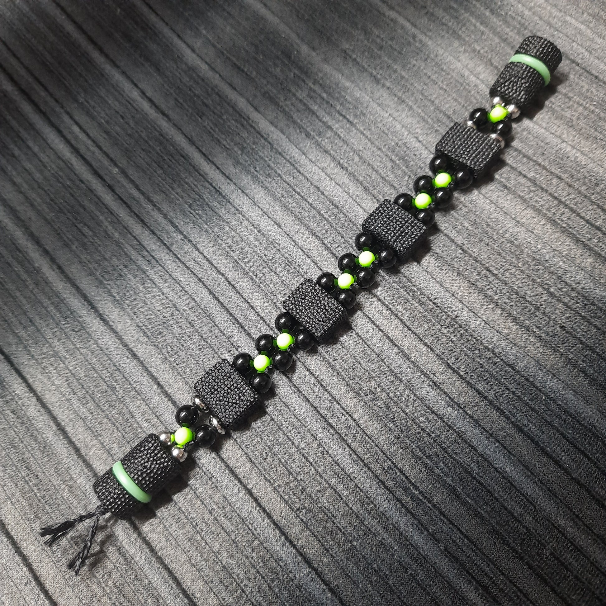 The rosary is mounted on kevlar cord.