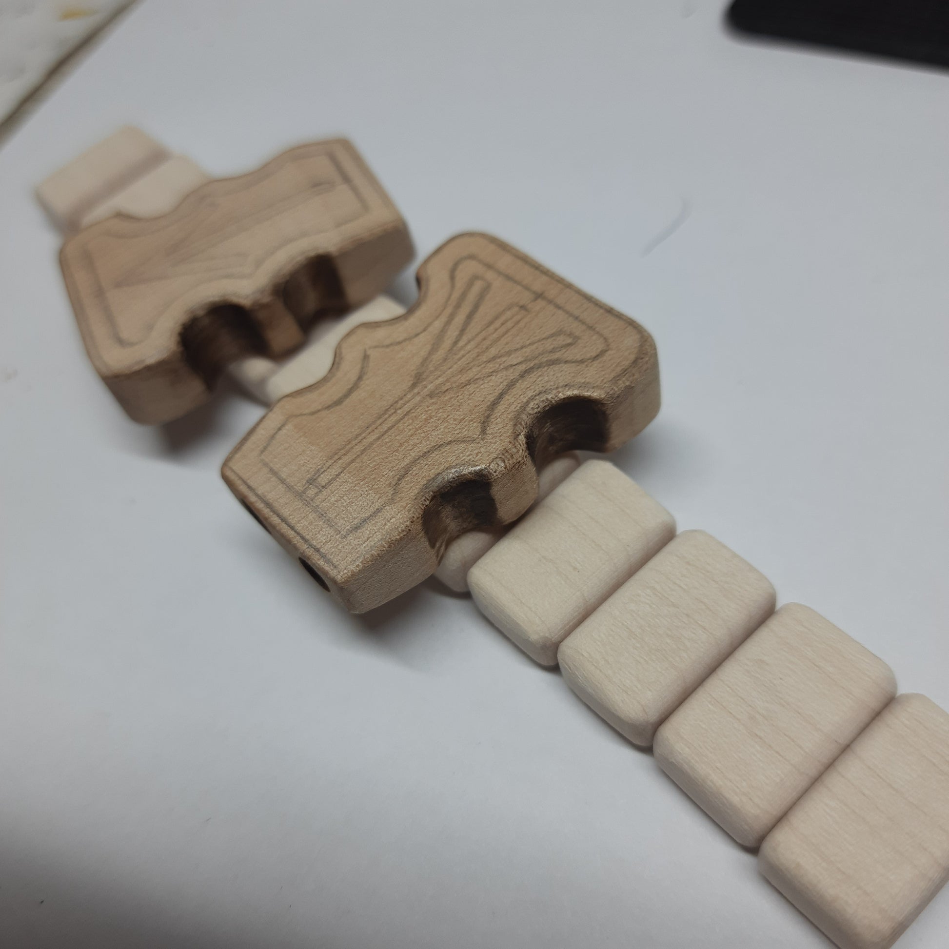 Materials: wood maple, stainless steel, kevlar cord.