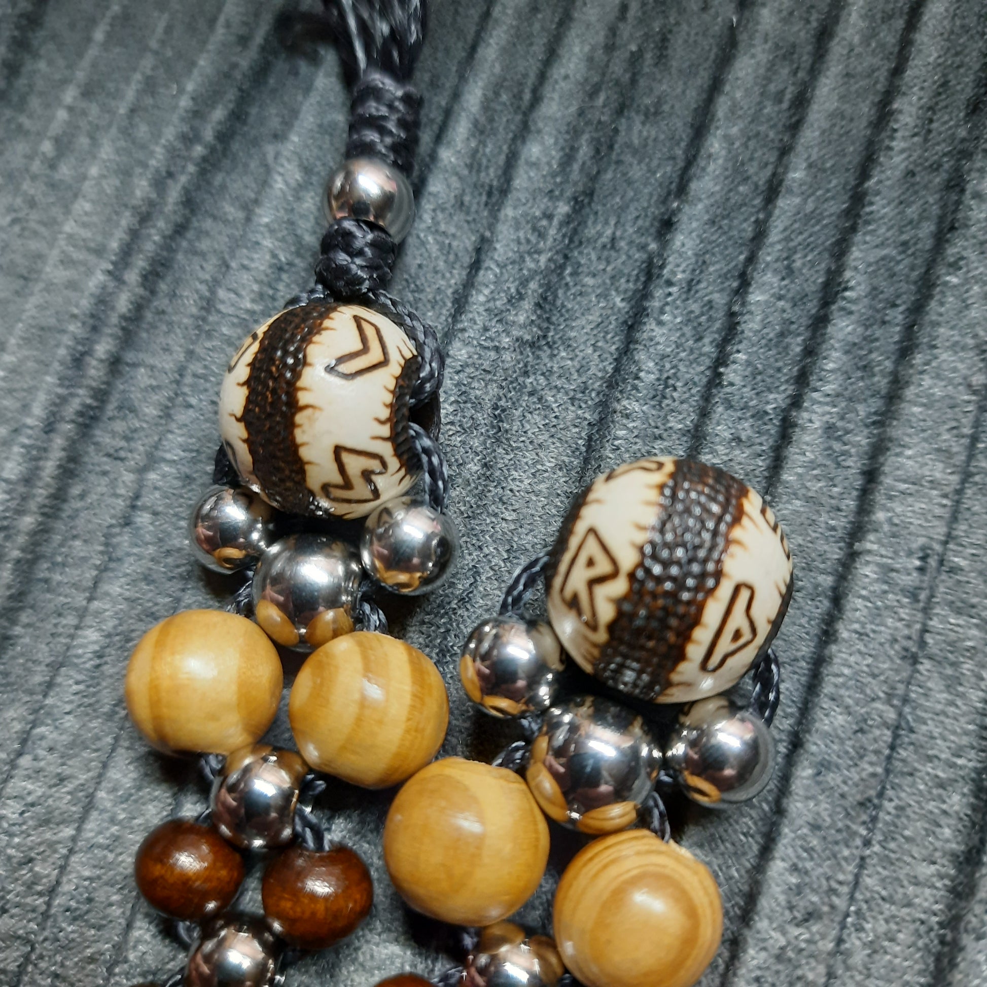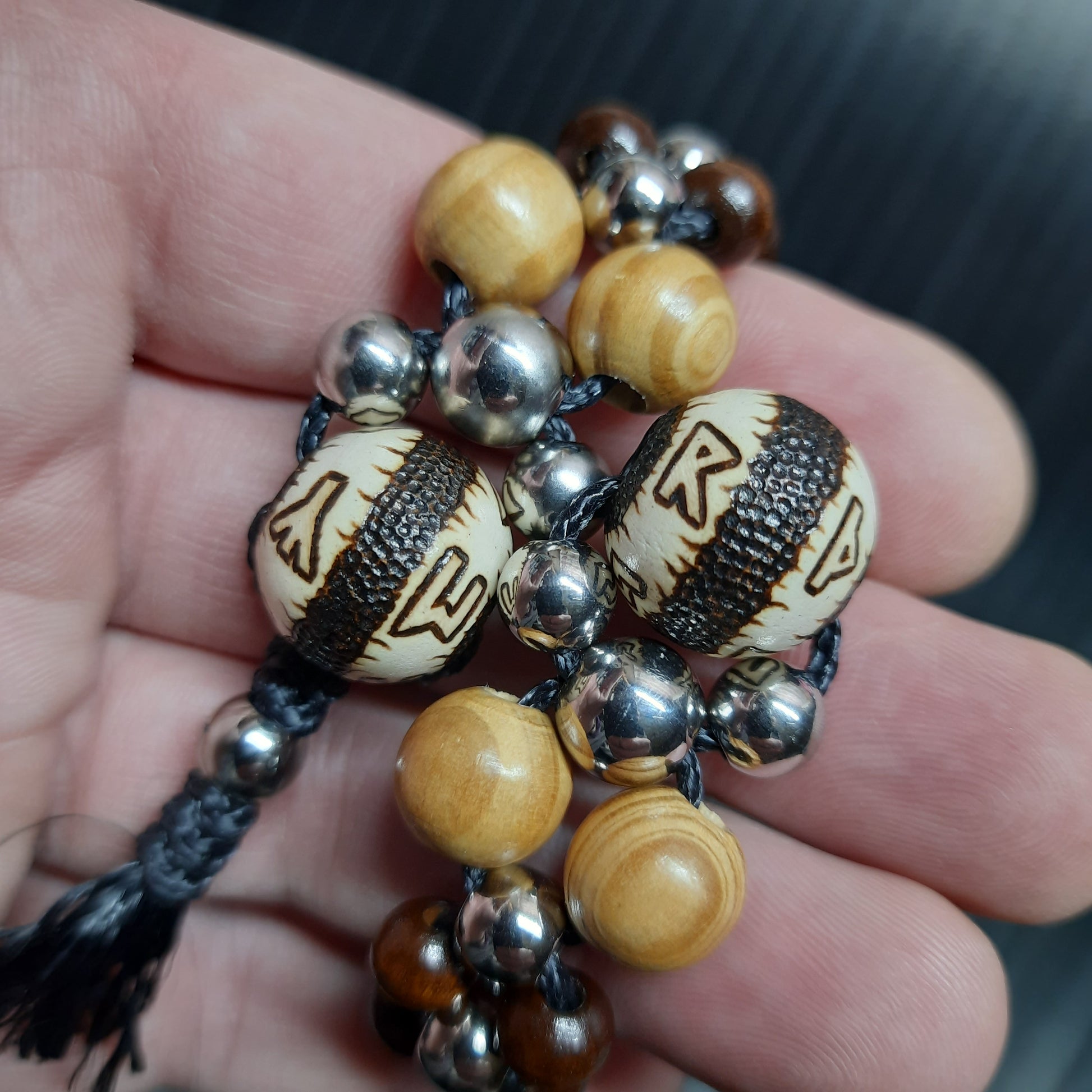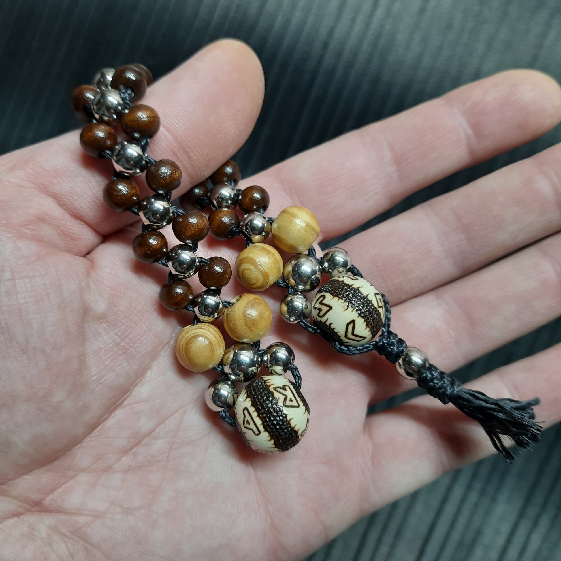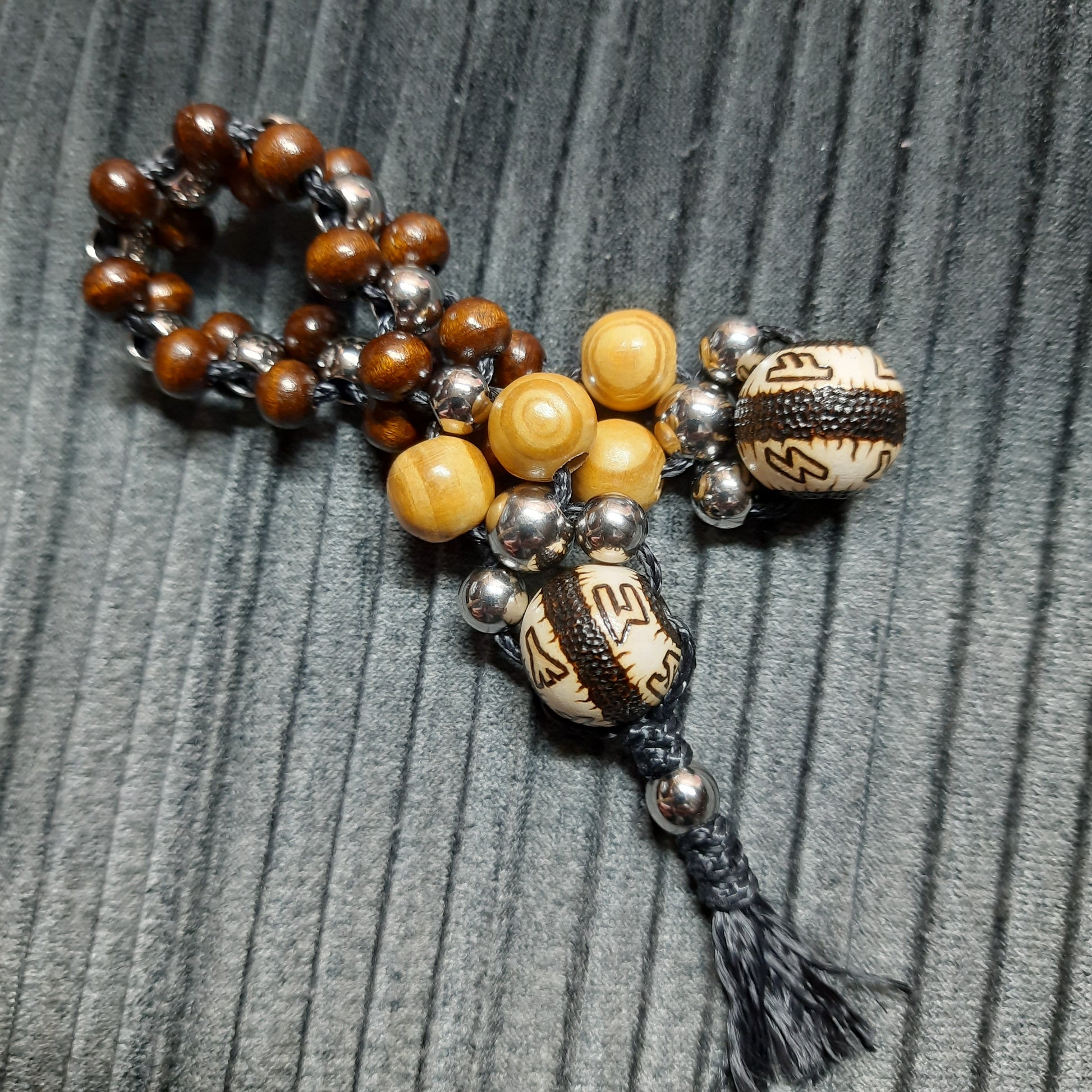 The rosary is mounted on kevlar cord.