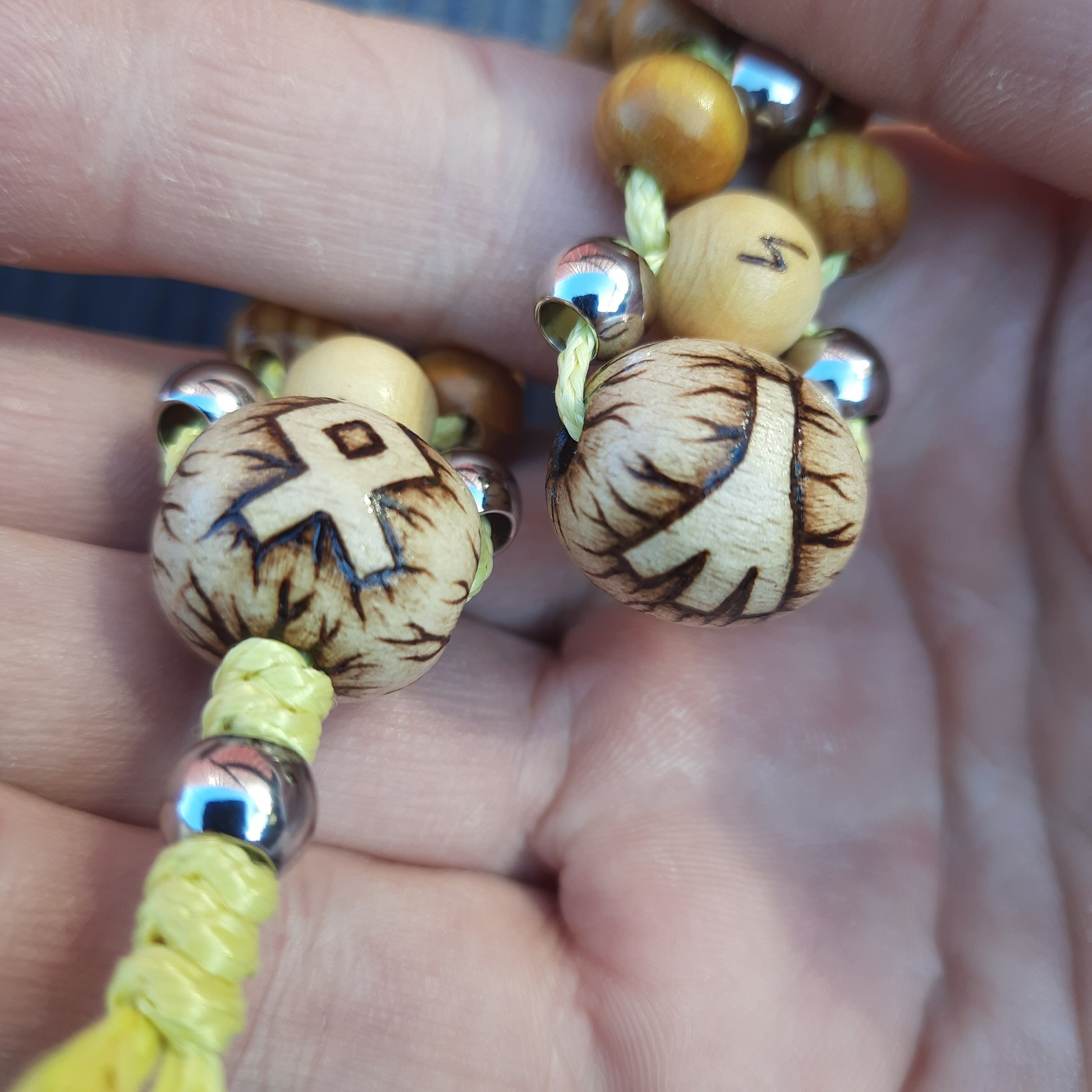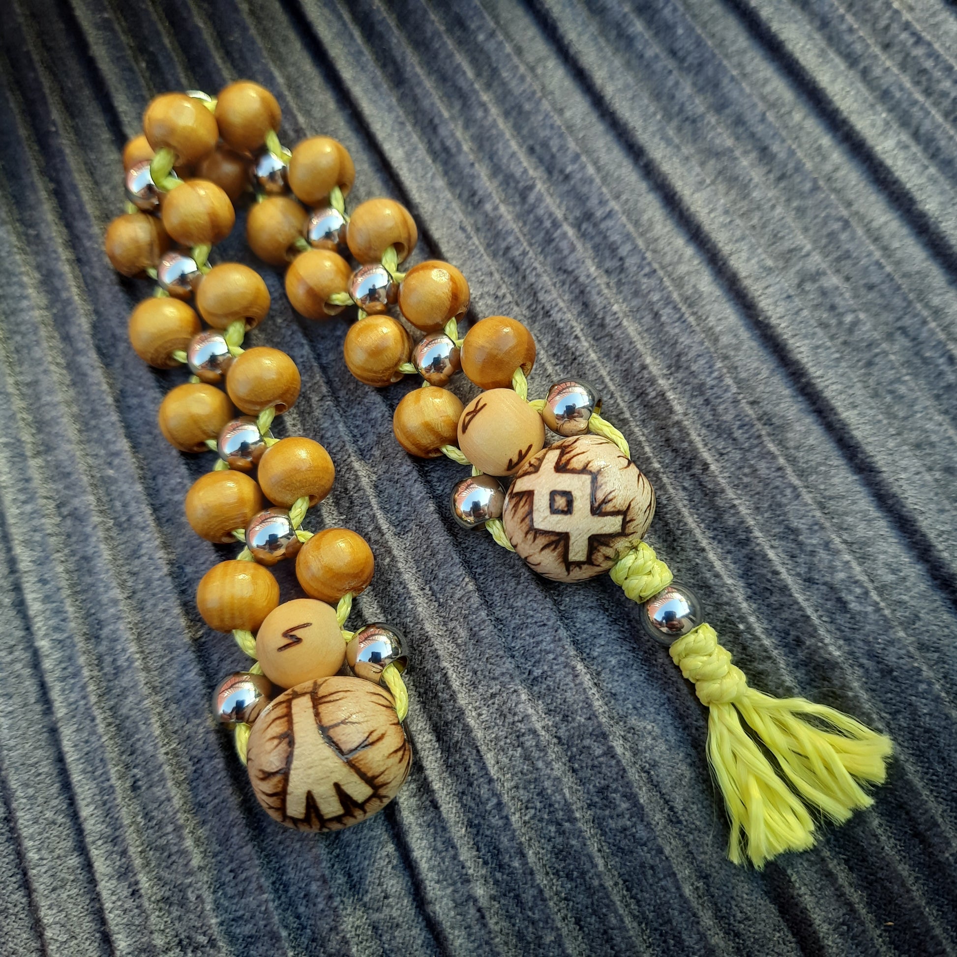 The rosary is mounted on kevlar cord.