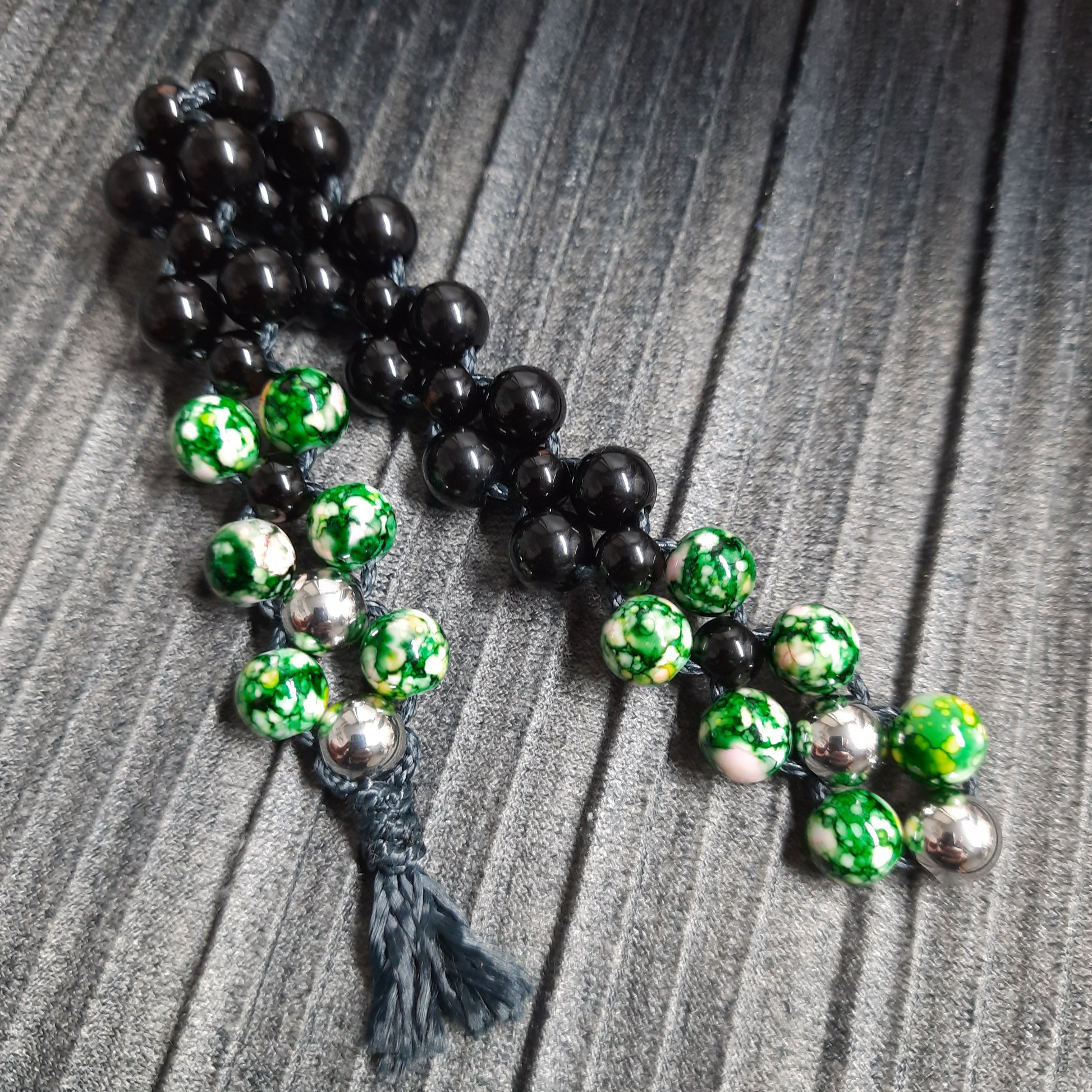 The rosary is mounted on kevlar laces.