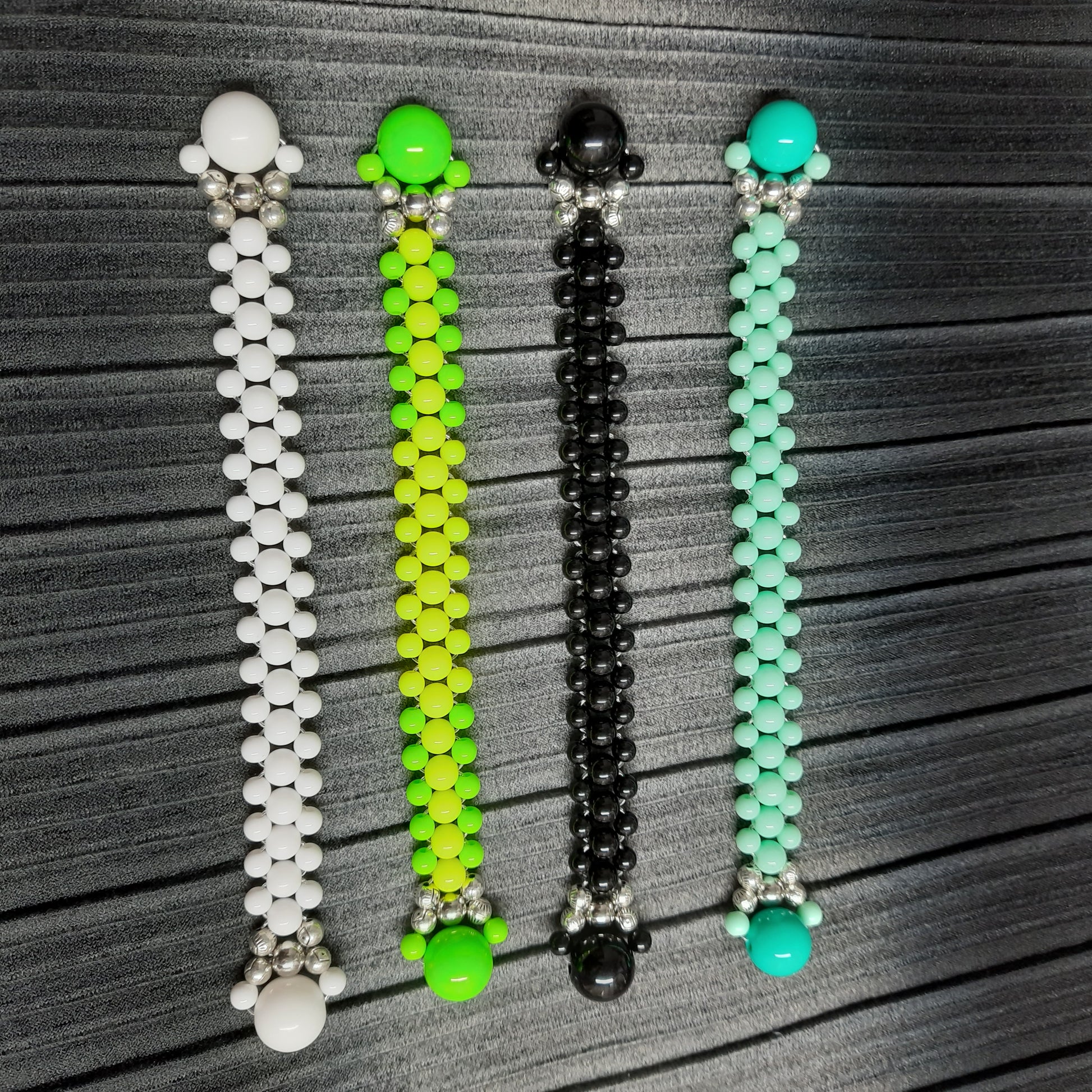 Materials: metal, stainless steel, acrylic, silicone cord.